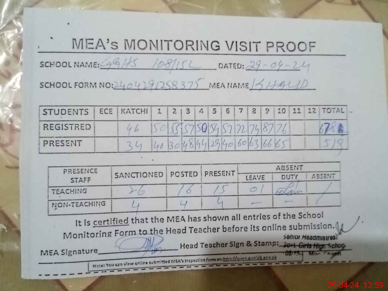 | Attendance Register | Head Teacher | MEA with School | Visit Proof |