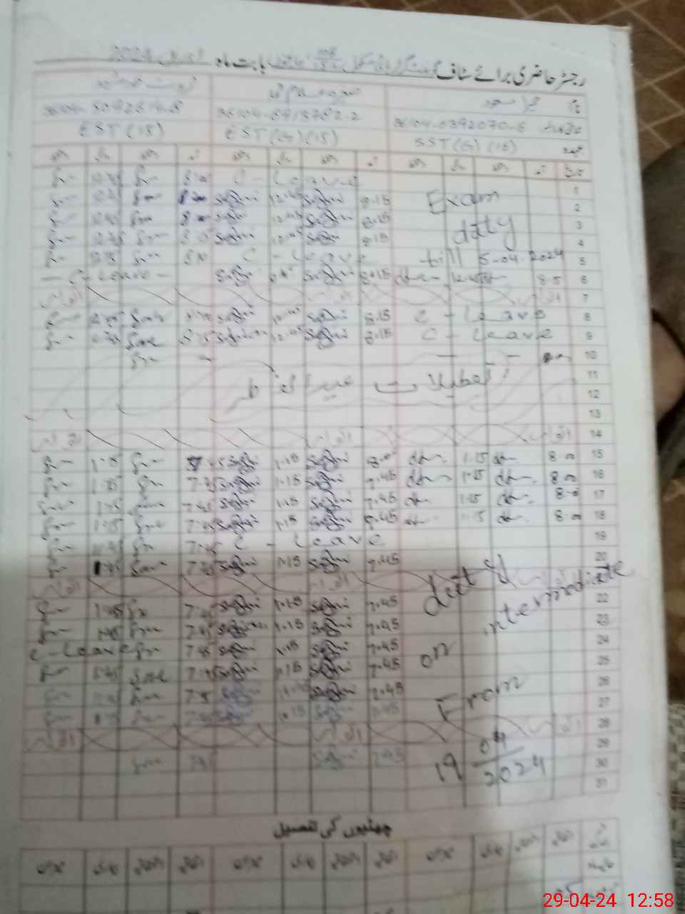 | CNIC | Full Name | Designation | R/C | Absence During Last Calender Month |