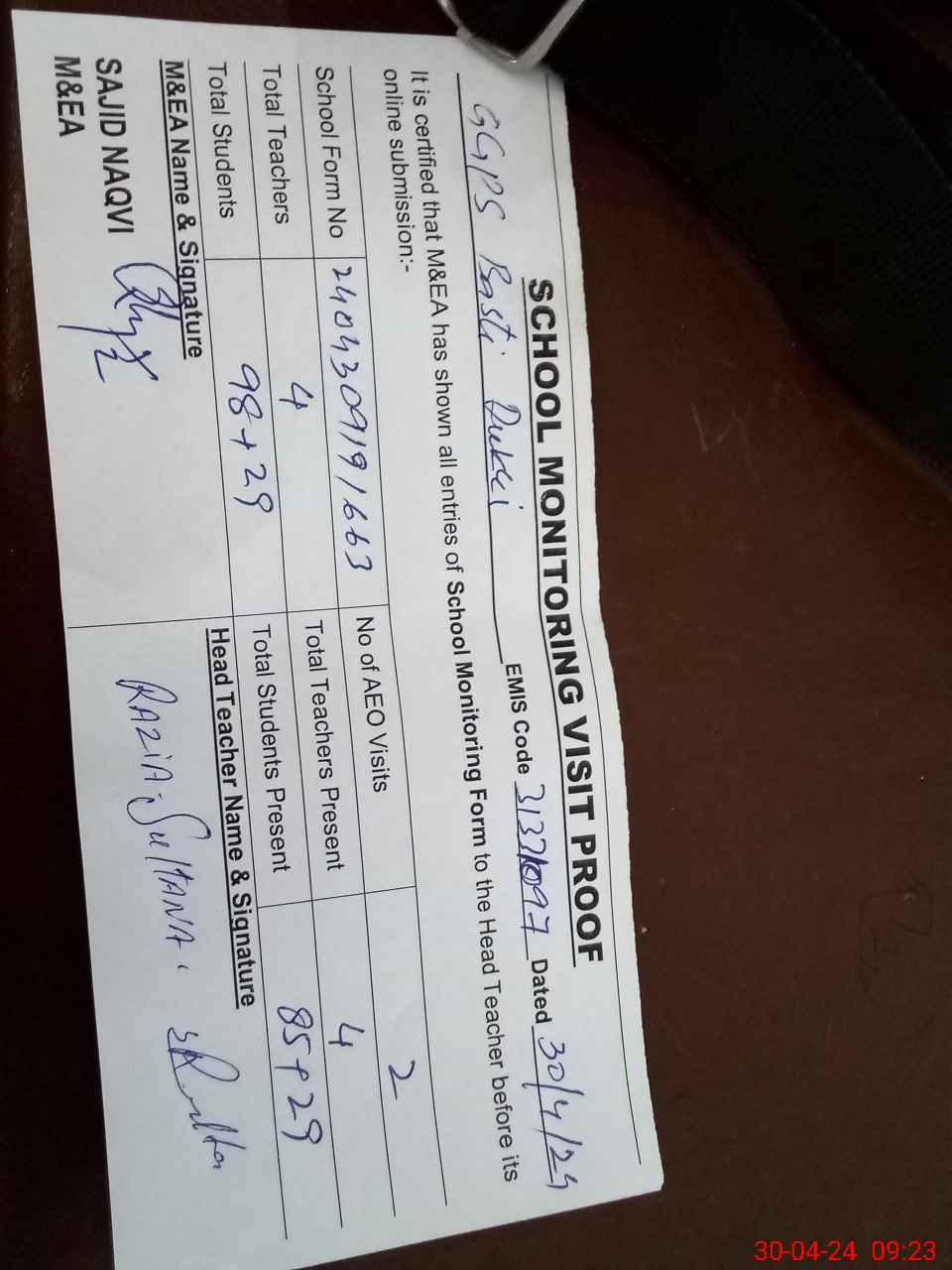| Attendance Register | Head Teacher | MEA with School | Visit Proof |