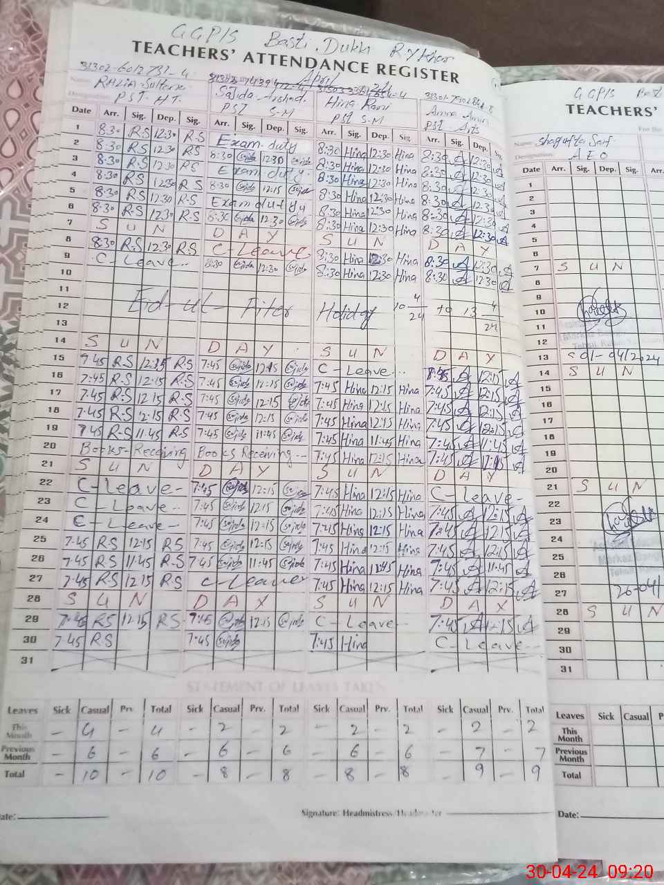 | Leave | Duty | Absent | Maternity | Medical | Ex- Pak |