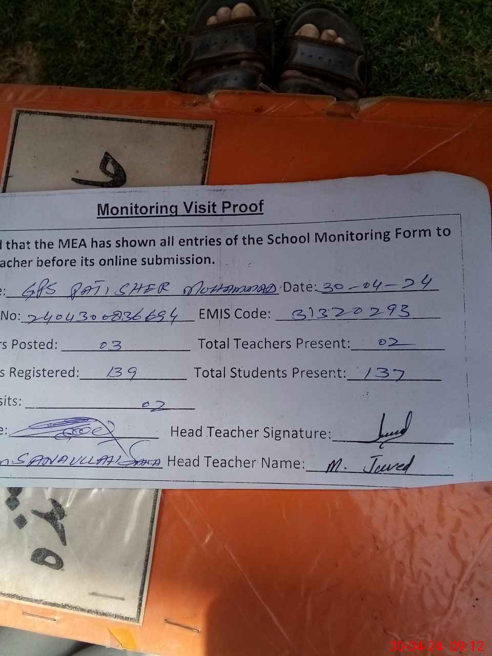 | Attendance Register | Head Teacher | MEA with School | Visit Proof |