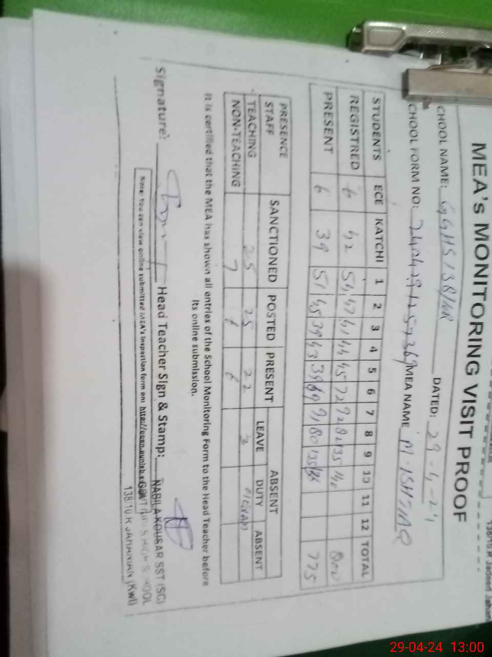 | Attendance Register | Head Teacher | MEA with School | Visit Proof |