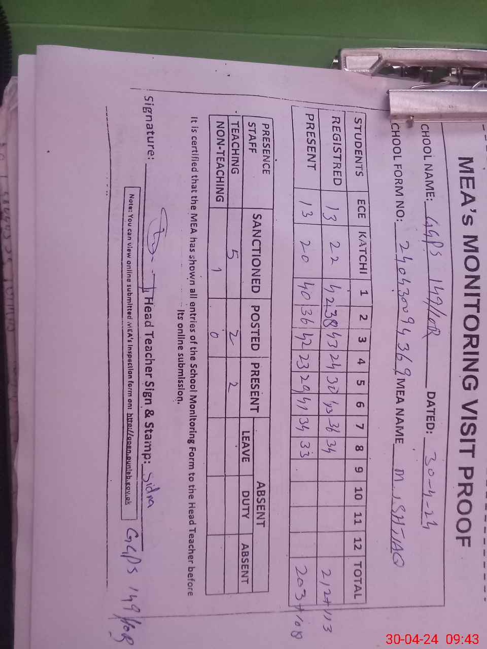 | Attendance Register | Head Teacher | MEA with School | Visit Proof |