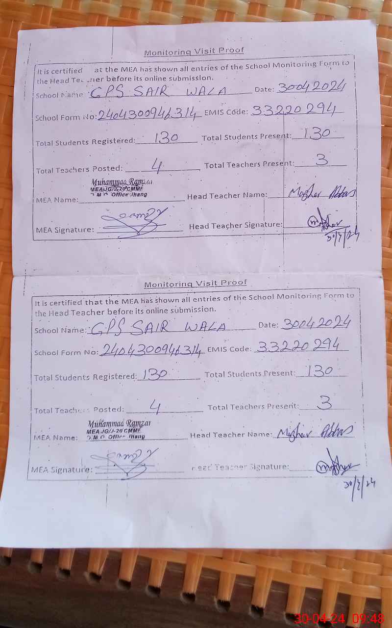 | EMIS Code: 33220294 | Name of School: GPS SAIR WALA | |||