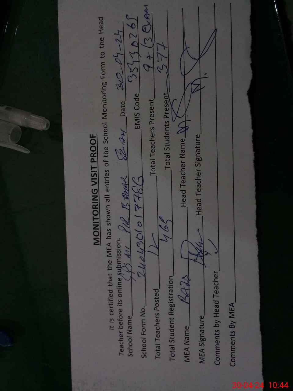 | Attendance Register | Head Teacher | MEA with School | Visit Proof |