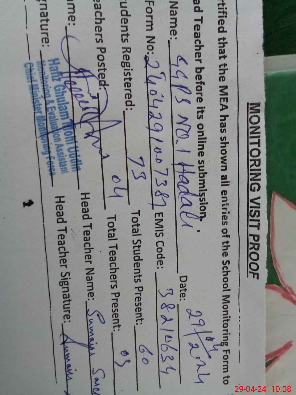 | Certified that this School was Inspected by the Undersigned MEA/DMO Today and the Information Stated Above is as Per Record. | |||||