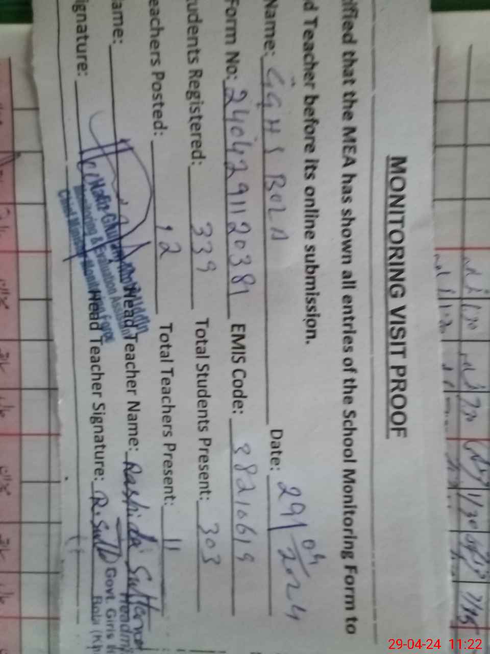 | Attendance Register | Head Teacher | MEA with School | Visit Proof |