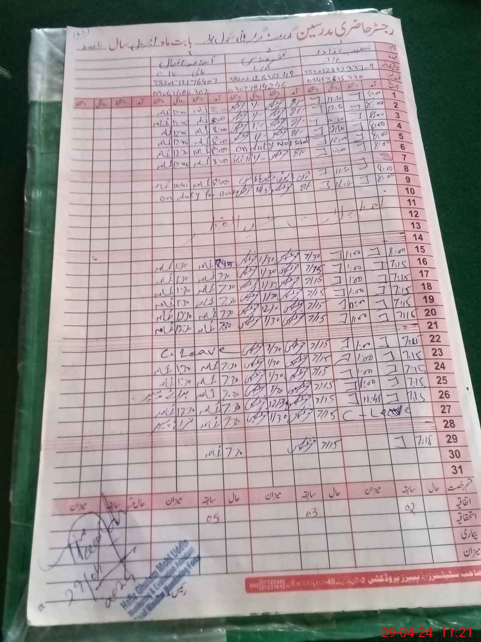 | CNIC | Full Name | Designation | R/C | Absence During Last Calender Month |