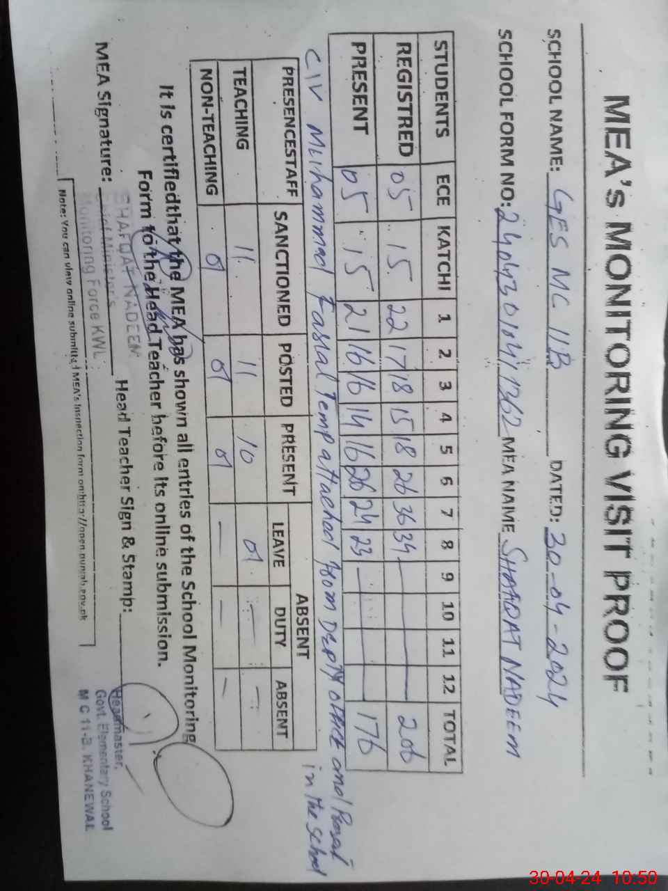 | EMIS Code: 36420637 | Name of School: GES MC 11-B KHANEWAL | |||