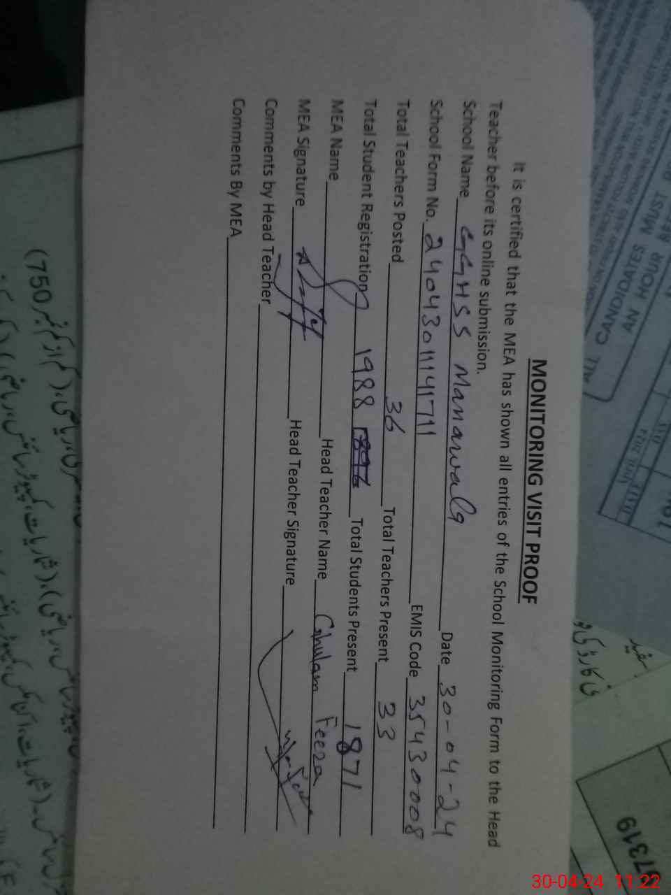 | Certified that this School was Inspected by the Undersigned MEA/DMO Today and the Information Stated Above is as Per Record. | |||||