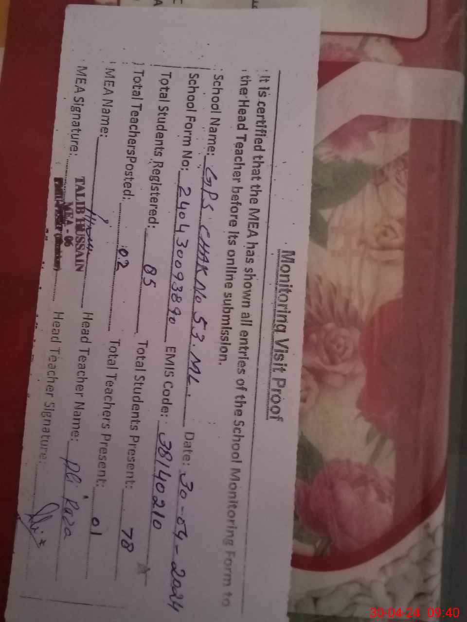 | EMIS Code: 38140210 | Name of School: GPS CHAK NO 53 ML | |||