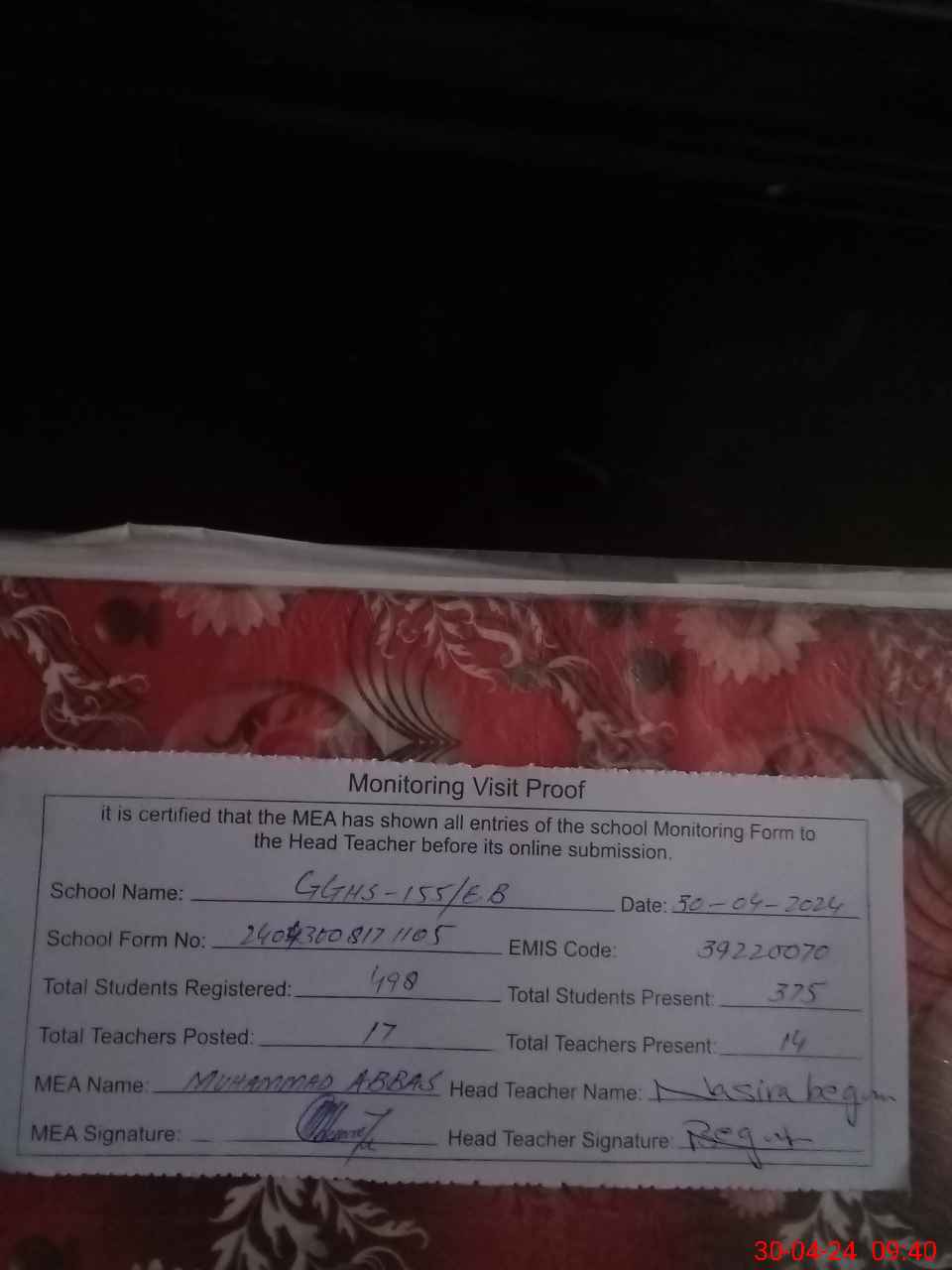 | EMIS Code: 39220070 | Name of School: GGHS 155 EB | |||