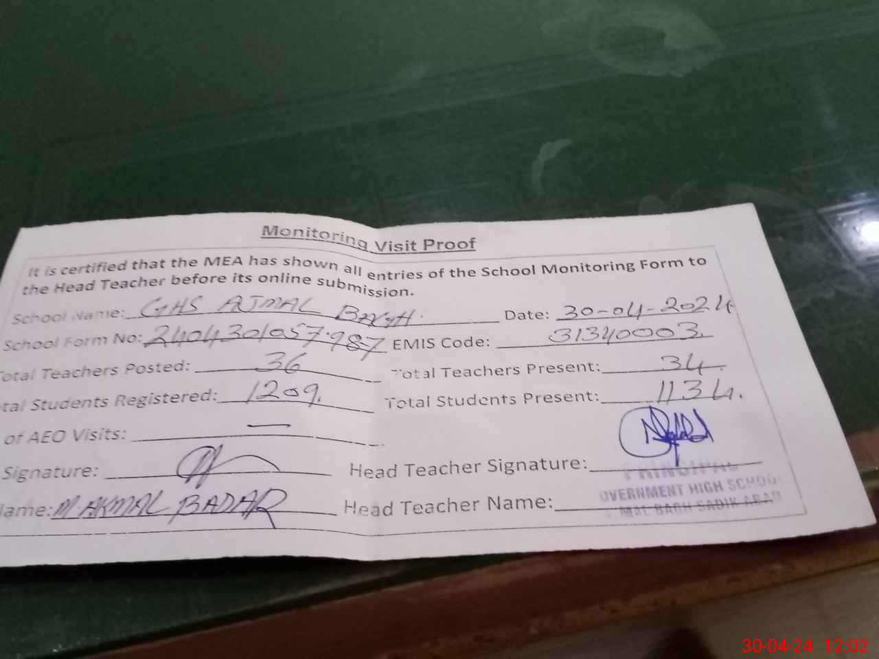 | Attendance Register | Head Teacher | MEA with School | Visit Proof |