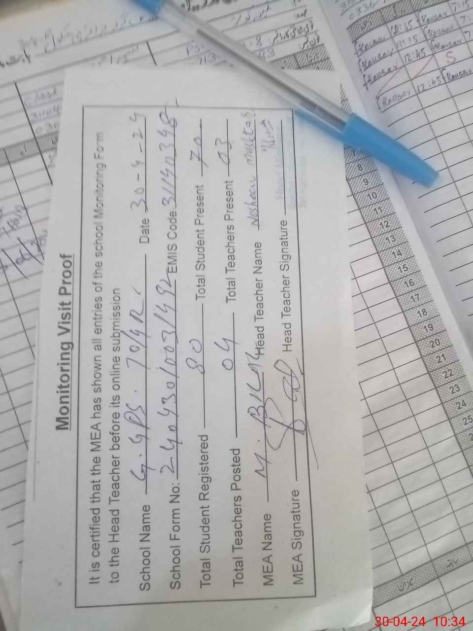 | Attendance Register | Head Teacher | MEA with School | Visit Proof |