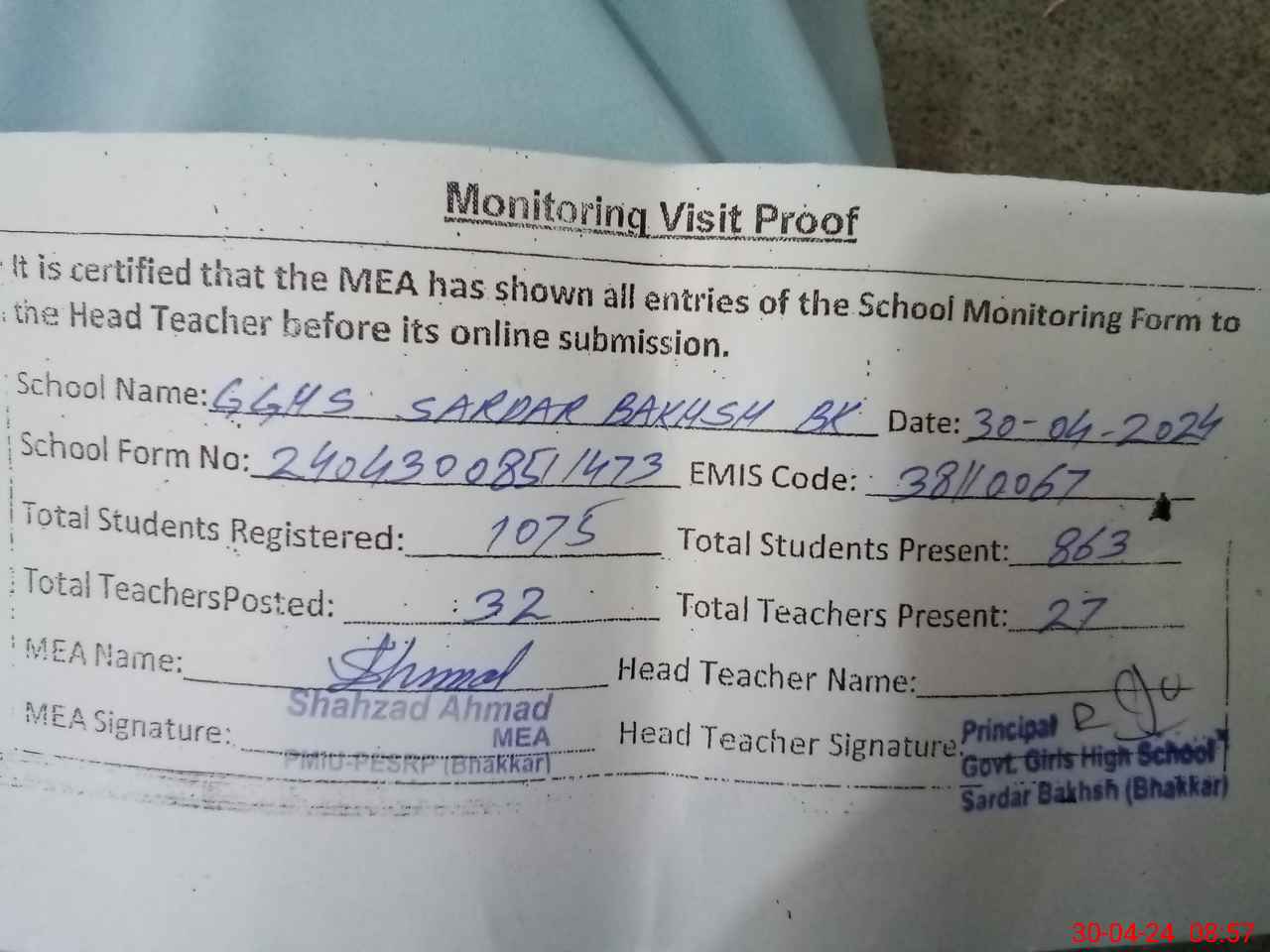 | EMIS Code: 38110067 | Name of School: GGHS SARDAR BAKHSH | |||