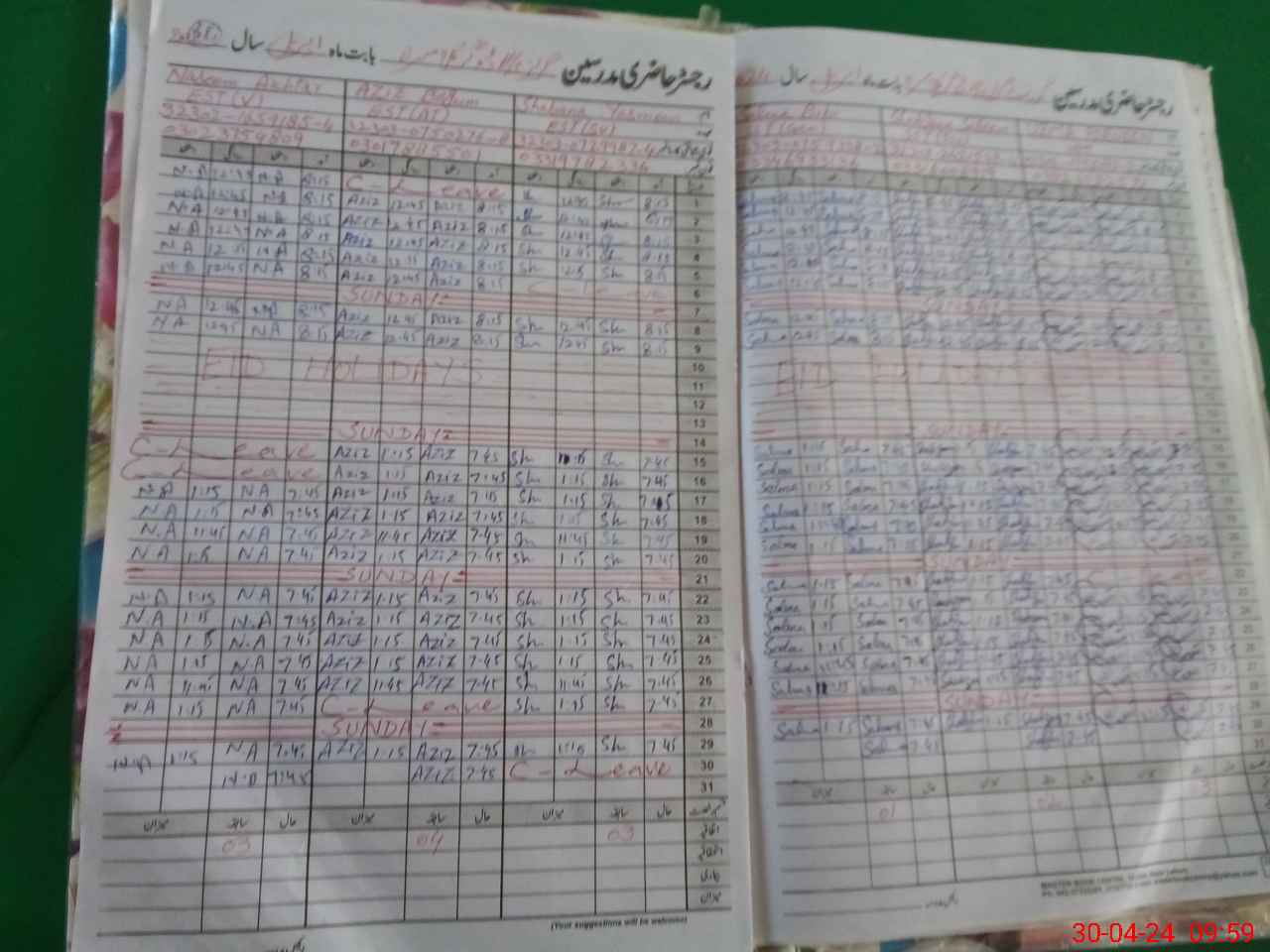 | CNIC | Full Name | Designation | R/C | Absence During Last Calender Month |