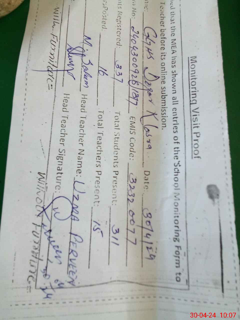 | Attendance Register | Head Teacher | MEA with School | Visit Proof |
