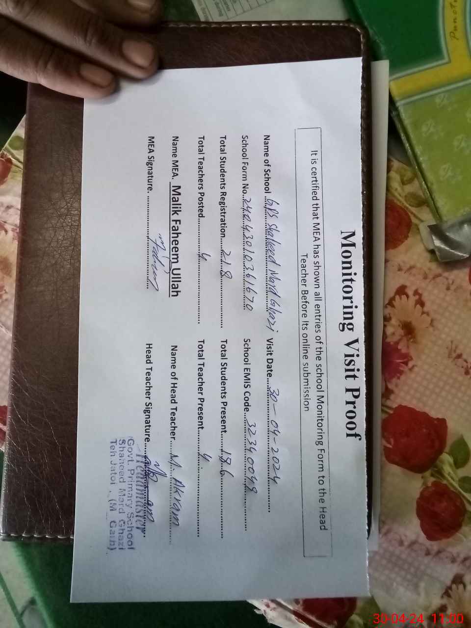 | Attendance Register | Head Teacher | MEA with School | Visit Proof |