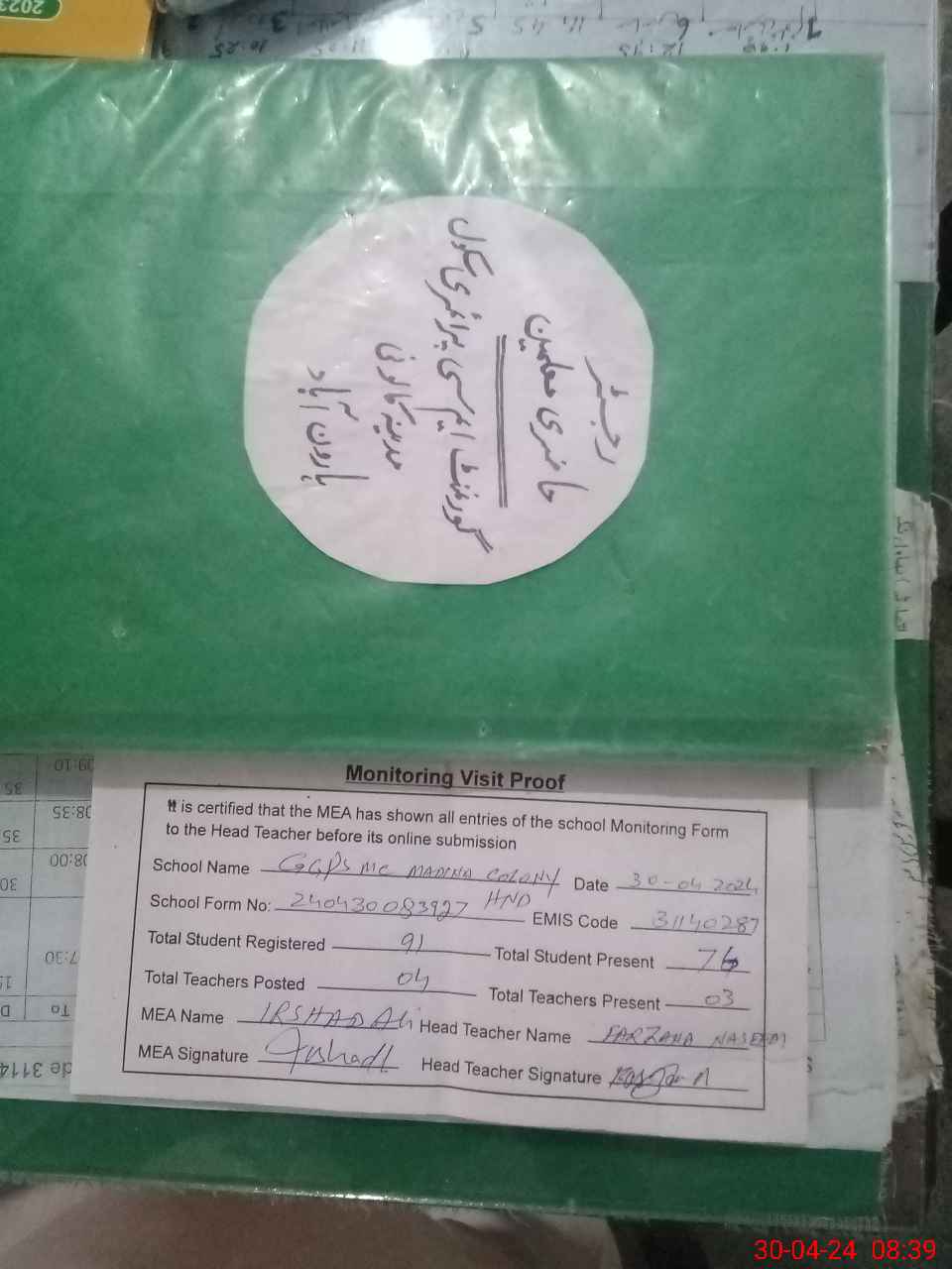 | EMIS Code: 31140287 | Name of School: GGPS MADINA COLONY | |||