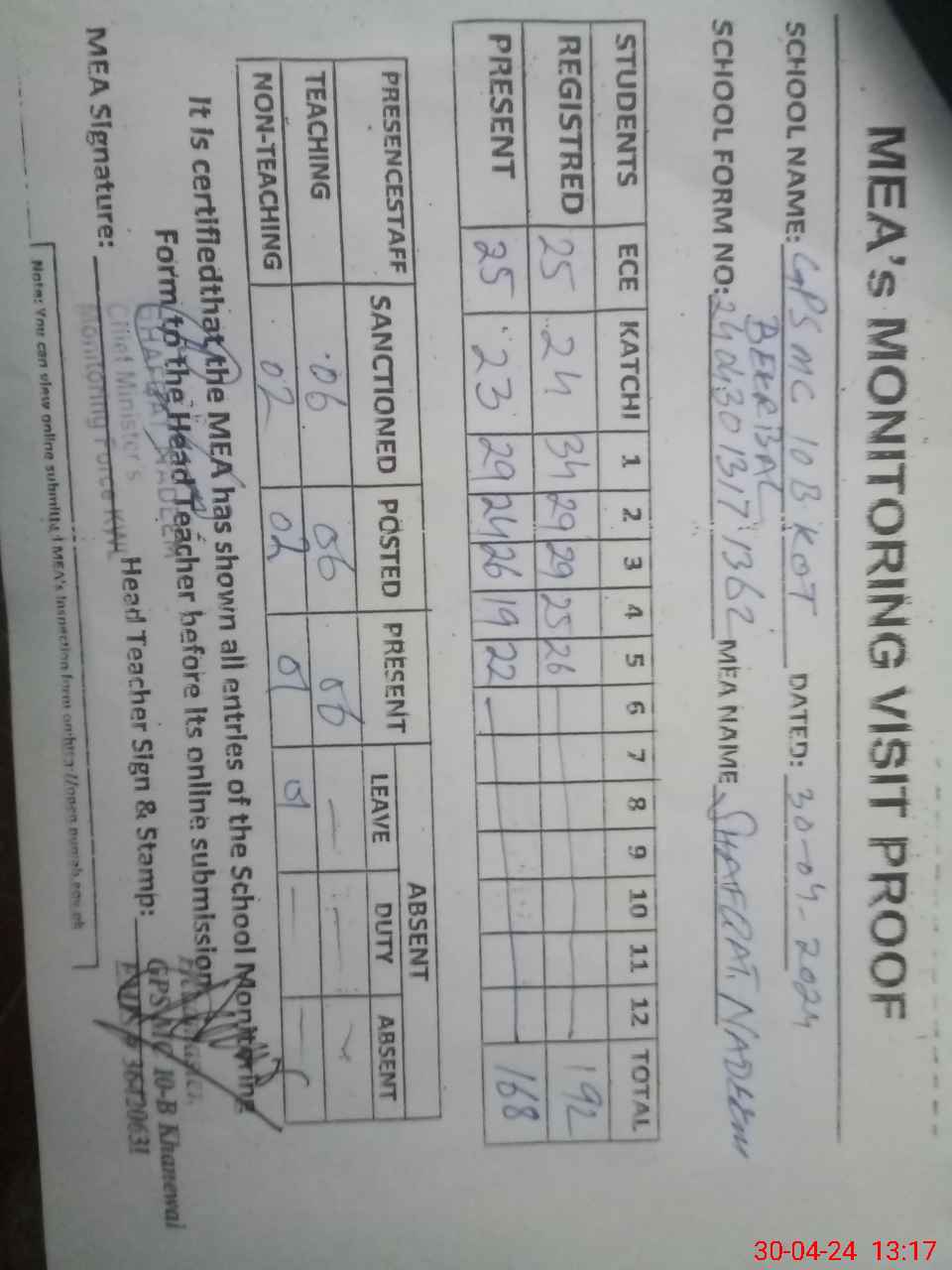| EMIS Code: 36420631 | Name of School: GPS MC 10-B KOT BERBAL KHANEWAL | |||