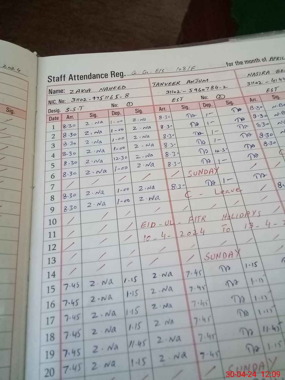 | CNIC | Full Name | Designation | R/C | Absence During Last Calender Month |