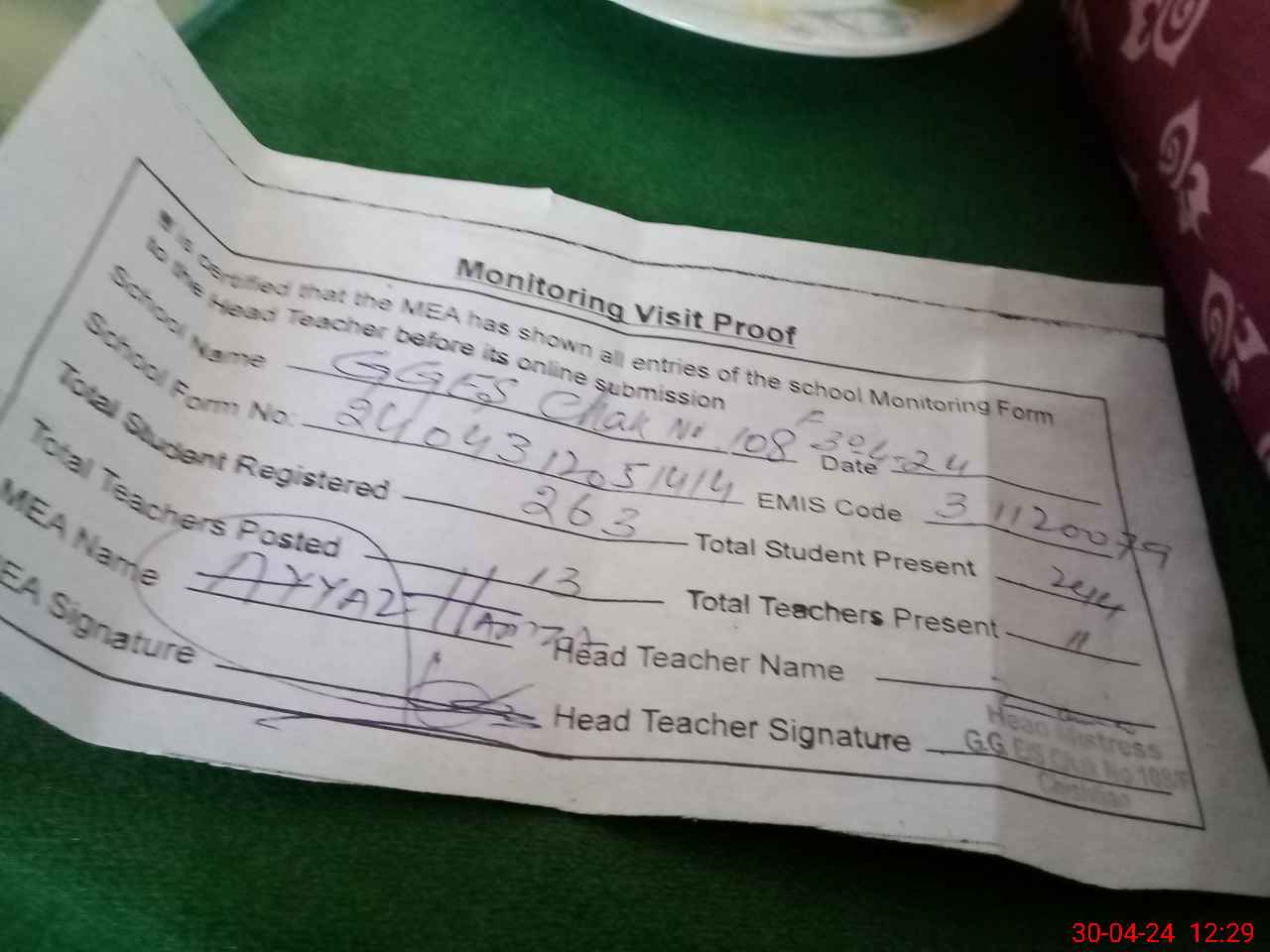 | Attendance Register | Head Teacher | MEA with School | Visit Proof |