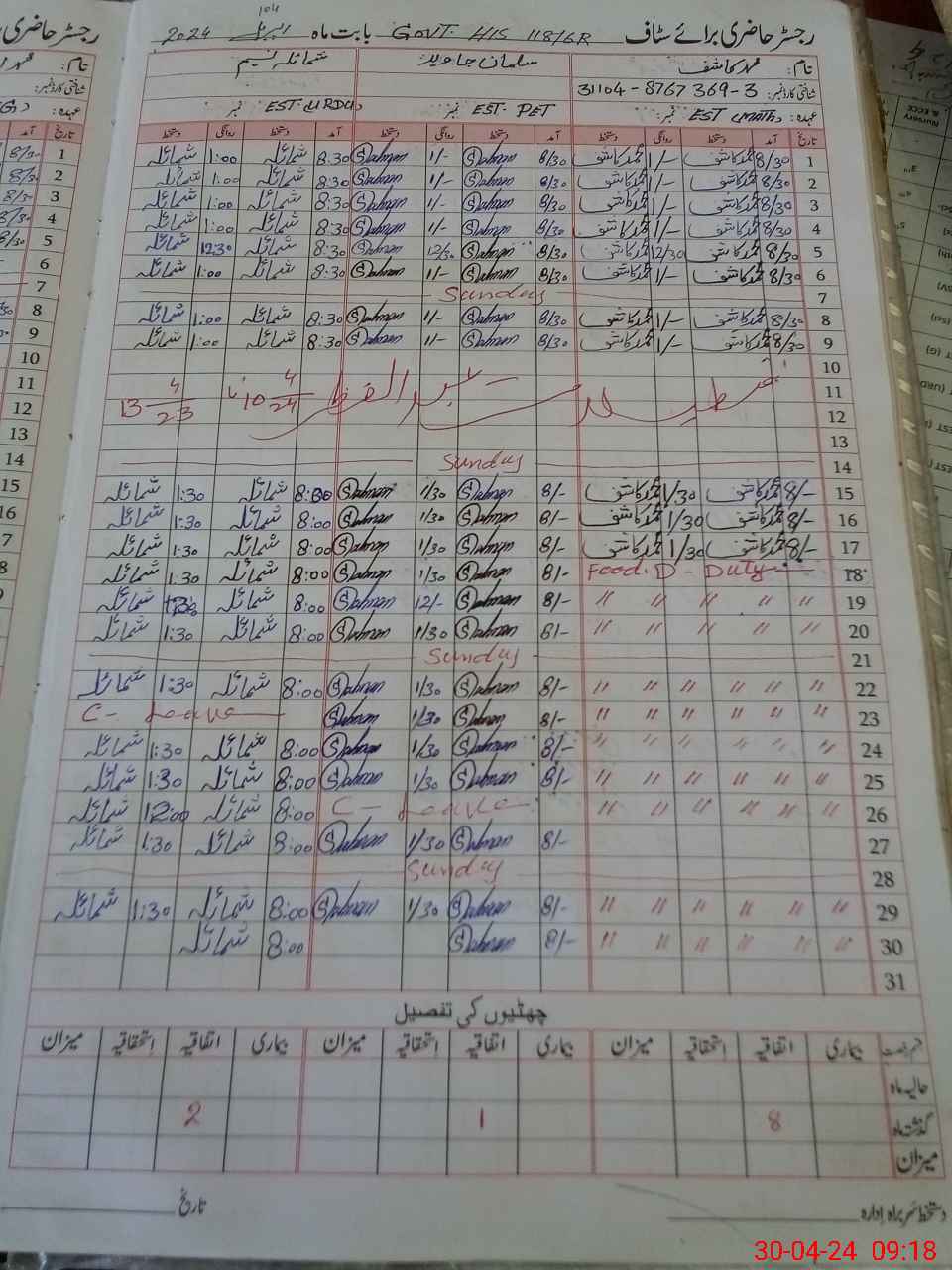 | CNIC | Full Name | Designation | R/C | Absence During Last Calender Month |