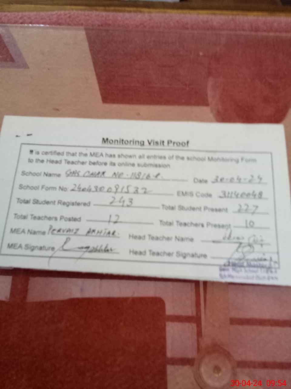 | Attendance Register | Head Teacher | MEA with School | Visit Proof |