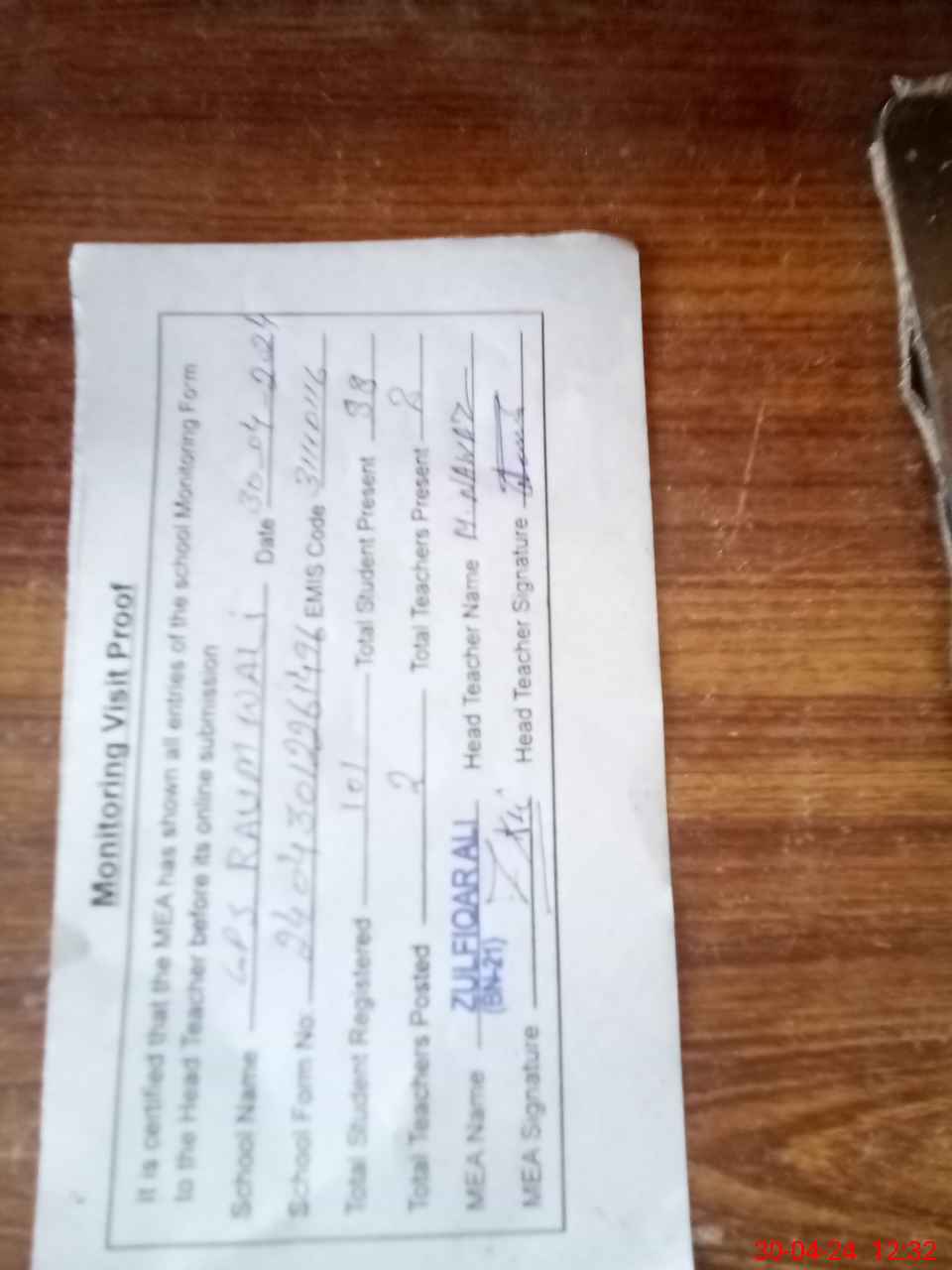 | Attendance Register | Head Teacher | MEA with School | Visit Proof |