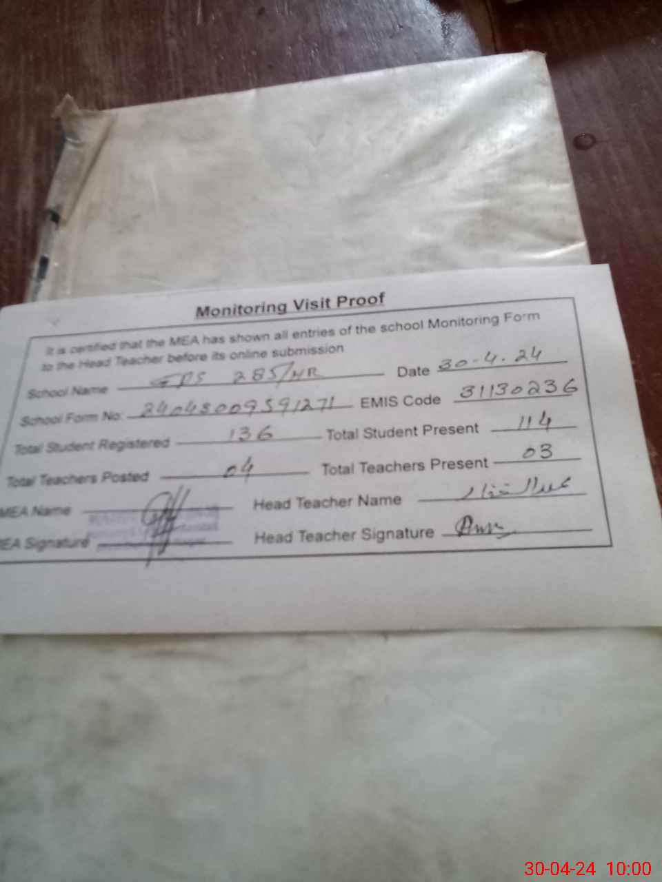 | Attendance Register | Head Teacher | MEA with School | Visit Proof |