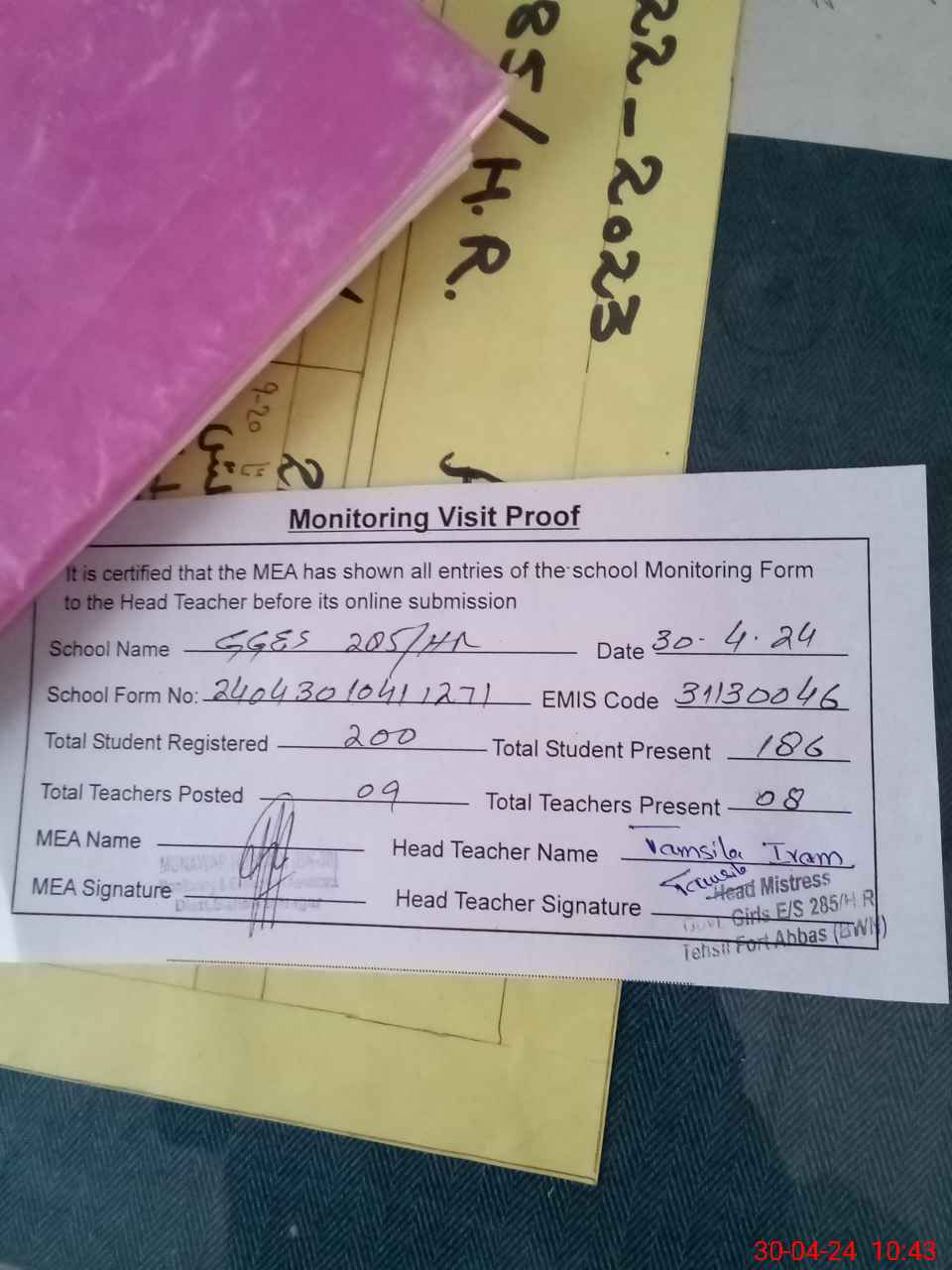 | EMIS Code: 31130046 | Name of School: GGES CHAK 285/HR | |||