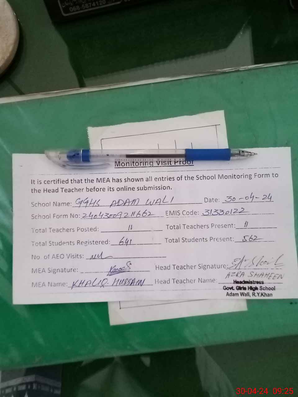 | Attendance Register | Head Teacher | MEA with School | Visit Proof |
