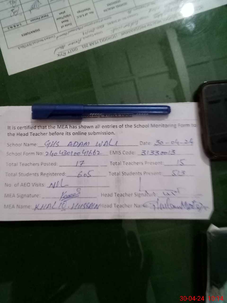 | Attendance Register | Head Teacher | MEA with School | Visit Proof |
