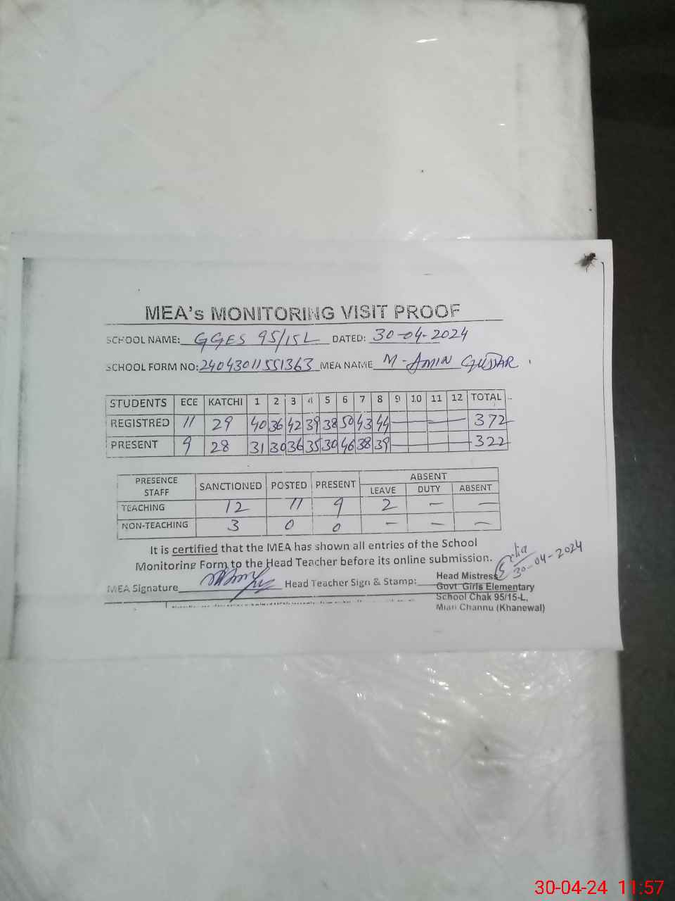 | Attendance Register | Head Teacher | MEA with School | Visit Proof |