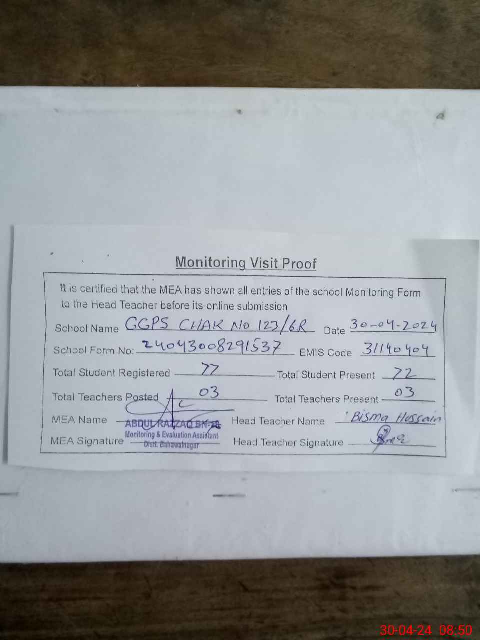 | Attendance Register | Head Teacher | MEA with School | Visit Proof |