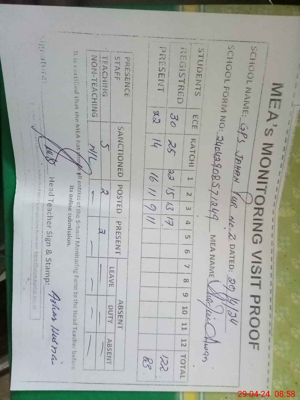 | Attendance Register | Head Teacher | MEA with School | Visit Proof |