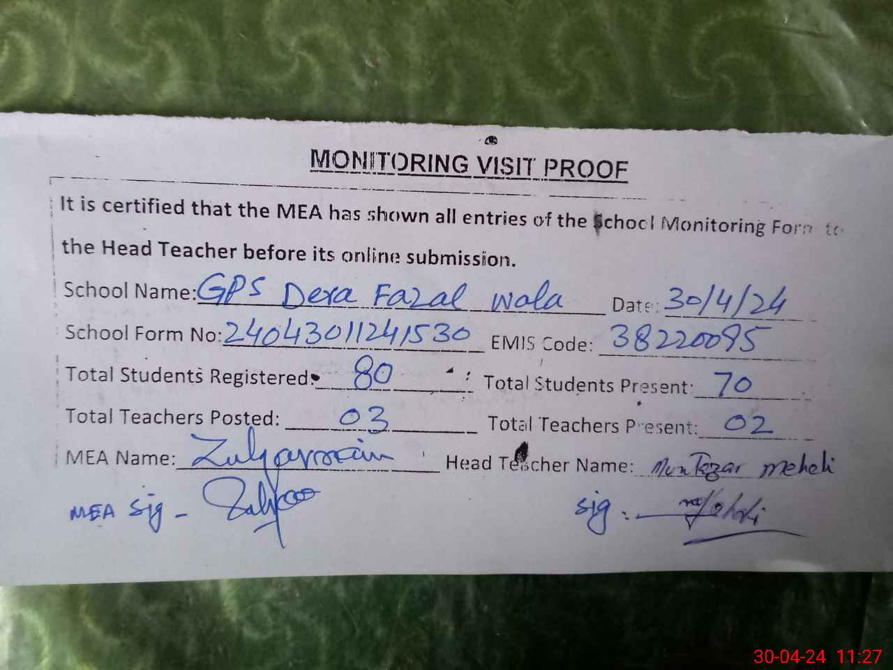 | Attendance Register | Head Teacher | MEA with School | Visit Proof |