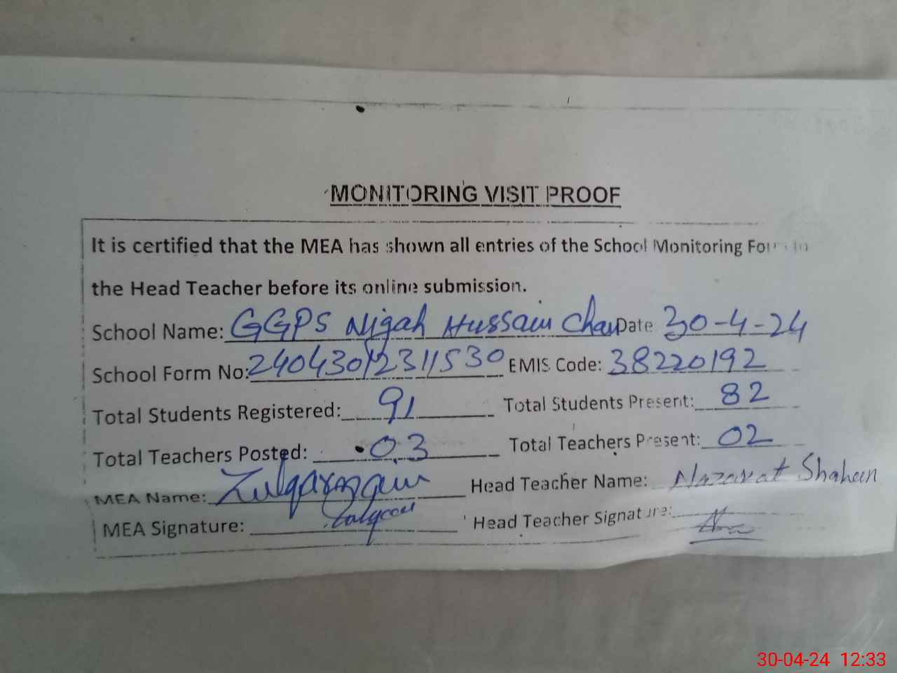 | EMIS Code: 38220192 | Name of School: GGPS NIGAH HUSSAIN CHAN | |||