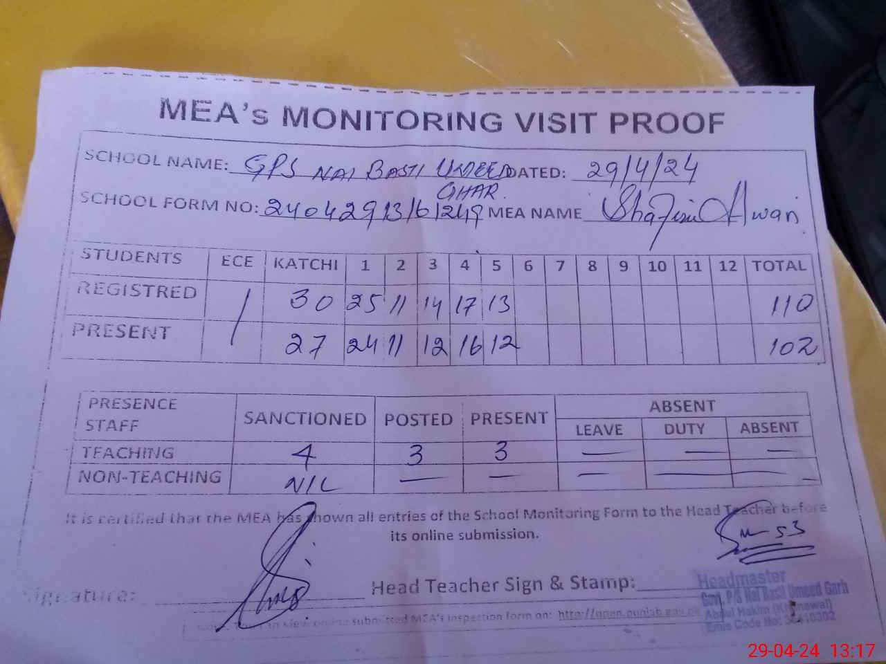 | Attendance Register | Head Teacher | MEA with School | Visit Proof |