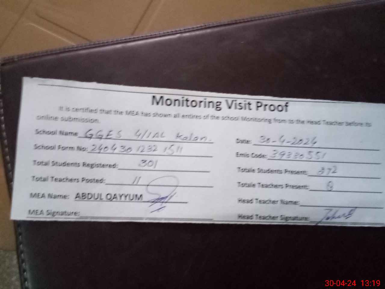 | EMIS Code: 39330551 | Name of School: GGES CHAK 4/1-AL KALAN | |||