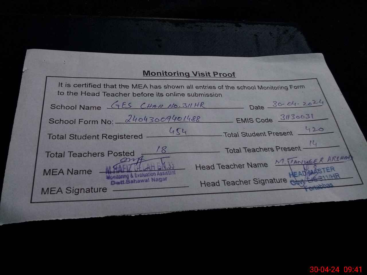 | Attendance Register | Head Teacher | MEA with School | Visit Proof |