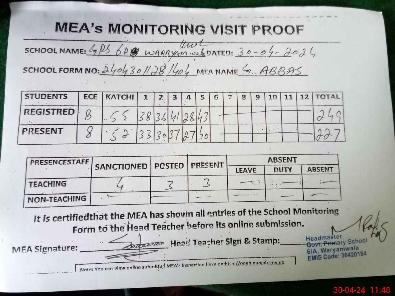 | EMIS Code: 36420184 | Name of School: GPS 6/A WARAYAM WALA, P/O 5/AH, KHANEWAL | |||