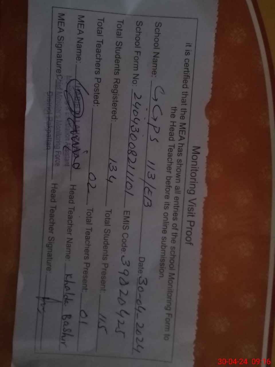 | Attendance Register | Head Teacher | MEA with School | Visit Proof |