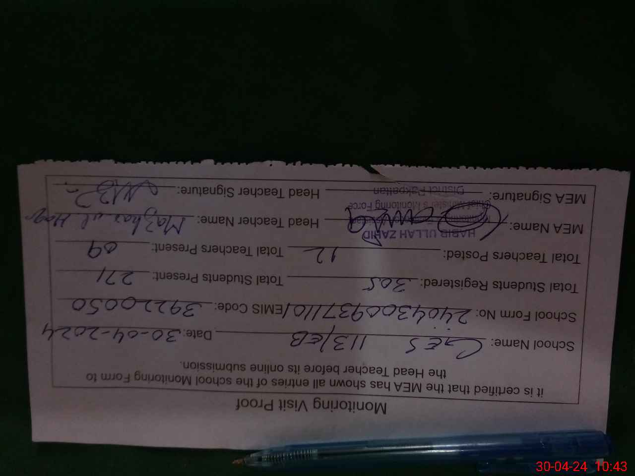 | Certified that this School was Inspected by the Undersigned MEA/DMO Today and the Information Stated Above is as Per Record. | |||||