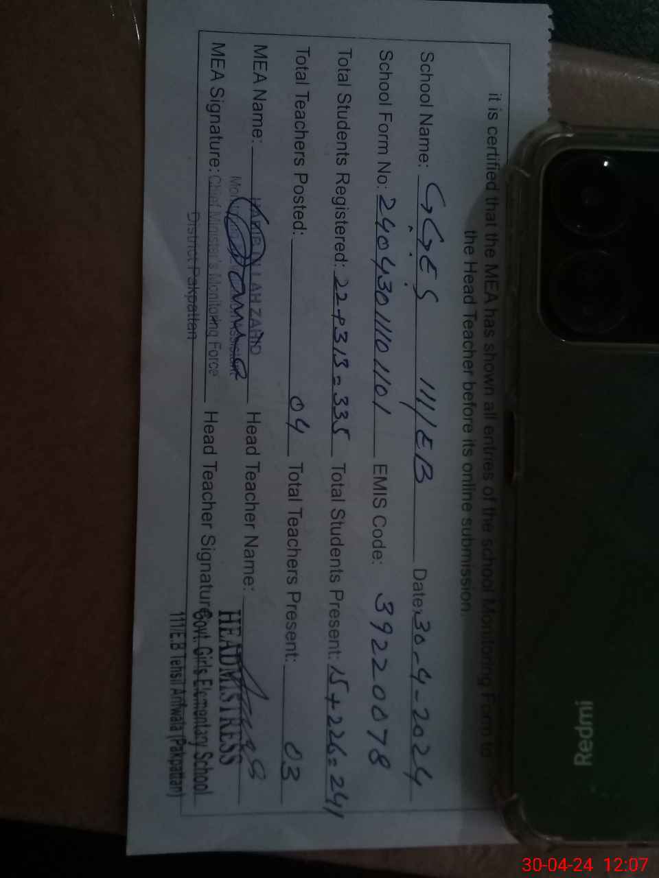 | Name: AM**** BE**** Designation: (School Headmaster's/Headmistress's) PST Phone/Cell Number: 03**** |