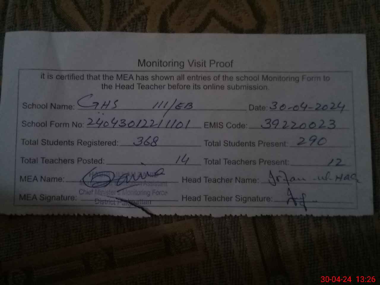 | EMIS Code: 39220023 | Name of School: GHS 111 EB | |||