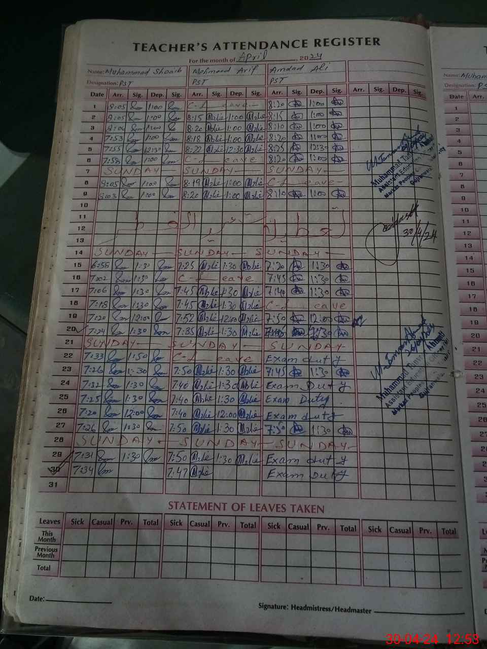 | 34**** | Am**** Al**** | PST | Regular | 2 | 0 | 0 | 0 | 0 | 0 | 0 | 0 | 2 | Exam Duty |
