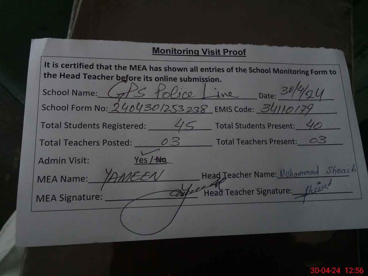 | Attendance Register | Head Teacher | MEA with School | Visit Proof |