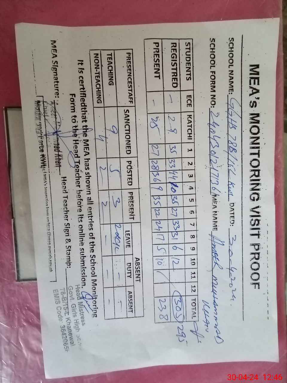 | EMIS Code: 36420656 | Name of School: GGHS 78-B/15-L, KACHA KHUH | |||