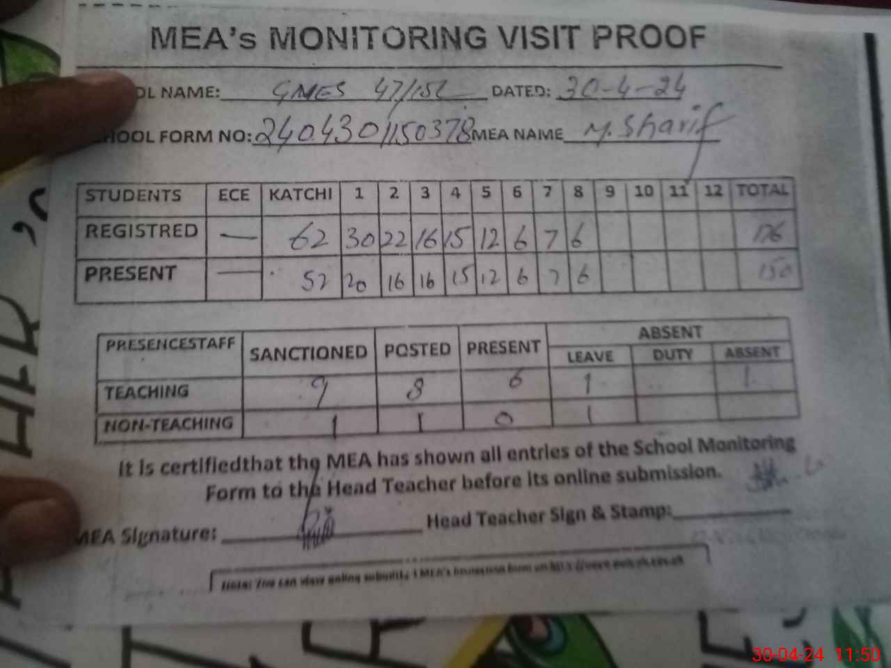 | Attendance Register | Head Teacher | MEA with School | Visit Proof |